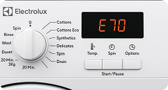 Код с ошибкой E70 на стиралке Electrolux может отобразиться вследствие выхода из строя датчика температуры. В этом случае стиральная машина перестанет нагревать воду в баке до нужной температуры. Иногда ошибка E70 появляется на дисплее, если неисправен нагревательный элемент, возник обрыв или замыкание проводки, вышел из строя электронный модуль управления.
